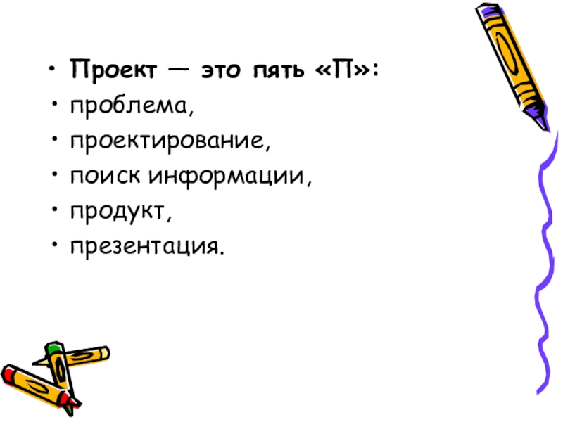 Проект — это пять «П»: проблема, проектирование, поиск информации, продукт, презентация.