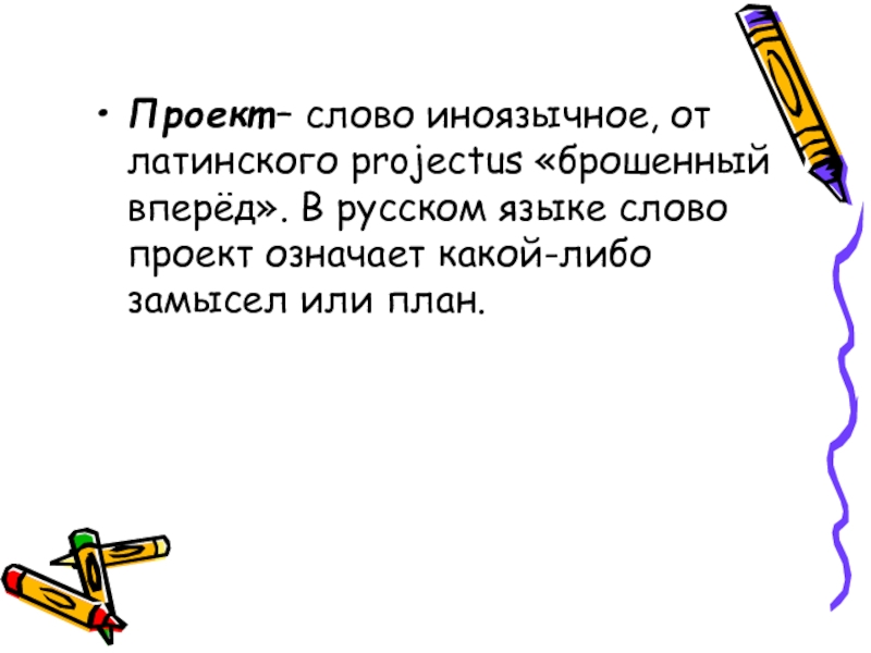 Проект – слово иноязычное, от латинского projectus «брошенный вперёд». В русском языке слово проект означает какой-либо замысел или план.