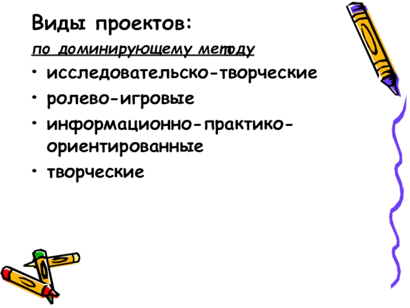 Виды проектов:по доминирующему методуисследовательско-творческиеролево-игровые информационно-практико-ориентированныетворческие