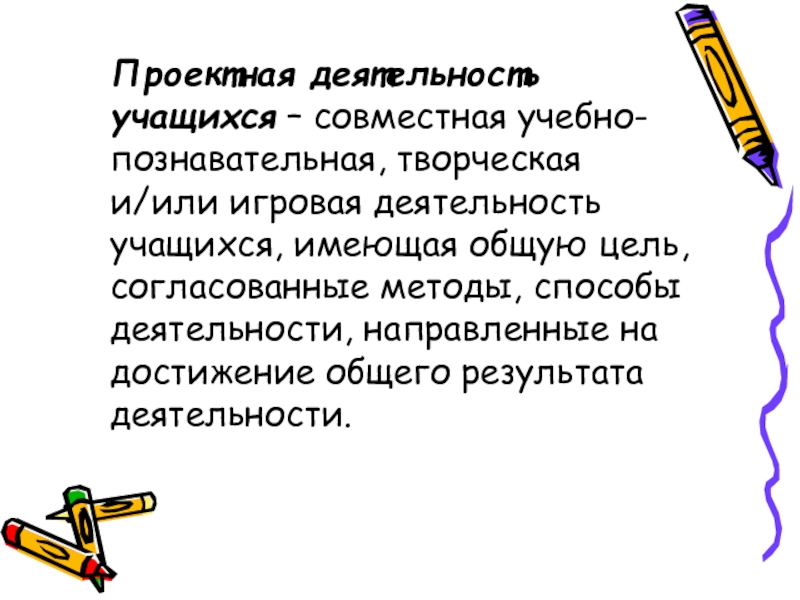 Проектная деятельность учащихся – совместная учебно-познавательная, творческая и/или игровая деятельность учащихся, имеющая общую цель, согласованные методы,