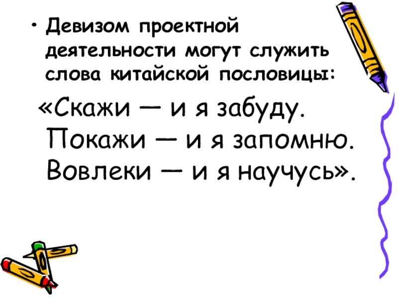 Девизом проектной деятельности могут служить слова китайской пословицы: «Скажи — и я забуду. Покажи — и я