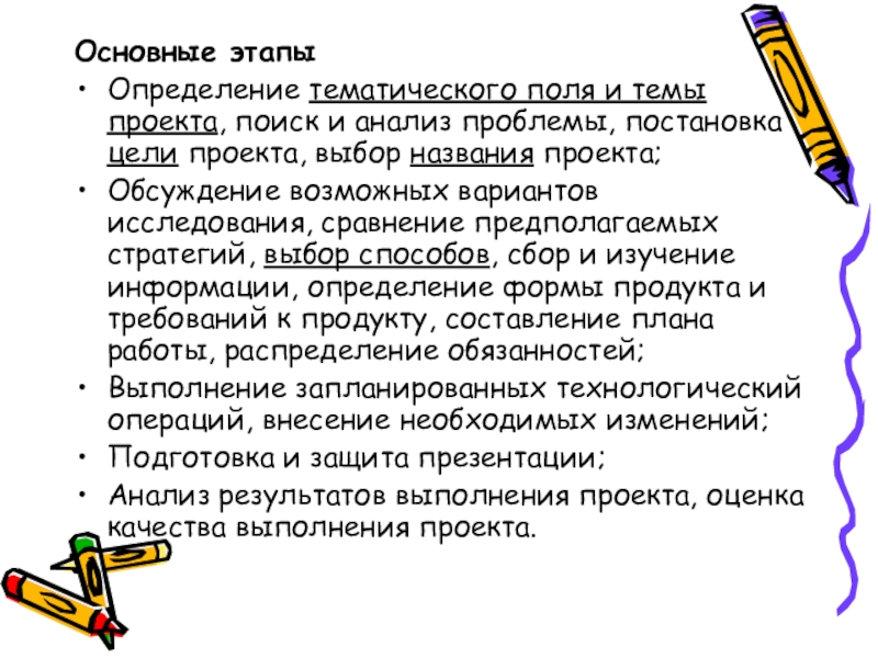 Основные этапыОпределение тематического поля и темы проекта, поиск и анализ проблемы, постановка цели проекта, выбор названия проекта;Обсуждение