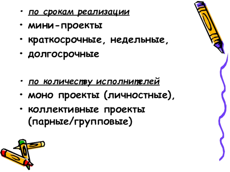 по срокам реализациимини-проектыкраткосрочные, недельные, долгосрочныепо количеству исполнителеймоно проекты (личностные),коллективные проекты (парные/групповые)