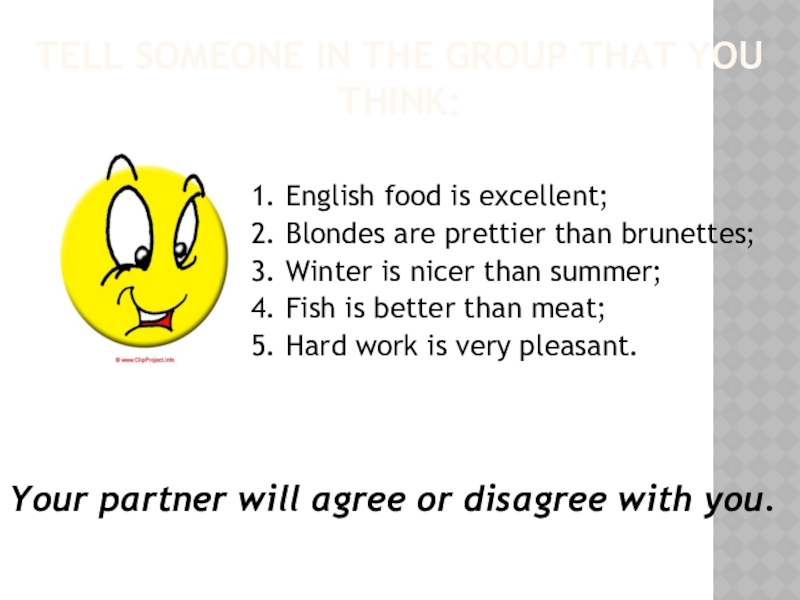 Слайд 21TELL SOMEONE IN THE GROUP THAT YOU THINK: