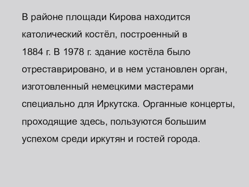 В 1978 г. здание костёла было отреставрировано, и в нем установлен орган, изготовленный немецкими мастерами специально для Иркутска. Органные концерты, проходящие здесь, пользуются большим успехом среди иркутян и гостей города.
