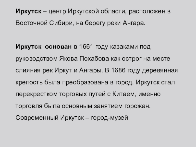 реки Ангара. Иркутск основан в 1661 году казаками под руководством Якова Похабова как острог на месте слияния рек Иркут и Ангары. В 1686 году деревянная крепость была преобразована в город. Иркутск стал перекрестком торговых путей с Китаем, именно торговля была основным занятием горожан. Современный Иркутск – город-музей
