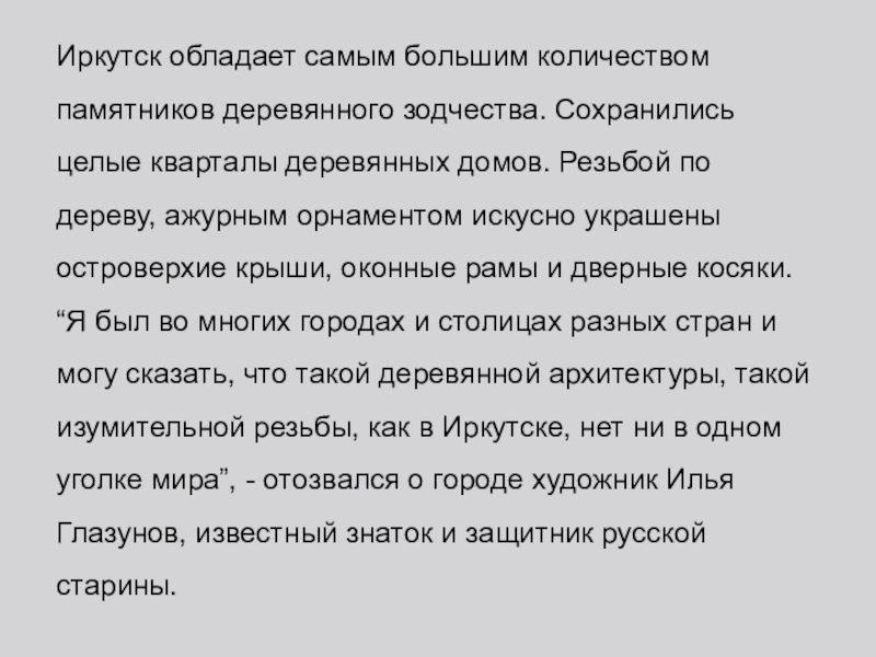 деревянных домов. Резьбой по дереву, ажурным орнаментом искусно украшены островерхие крыши, оконные рамы и дверные косяки. “Я был во многих городах и столицах разных стран и могу сказать, что такой деревянной архитектуры, такой изумительной резьбы, как в Иркутске, нет ни в одном уголке мира”, - отозвался о городе художник Илья Глазунов, известный знаток и защитник русской старины.