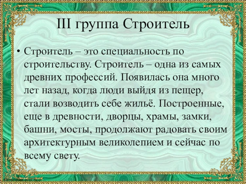 ІІІ группа СтроительСтроитель – это специальность по строительству. Строитель – одна из самых древних профессий. Появилась она