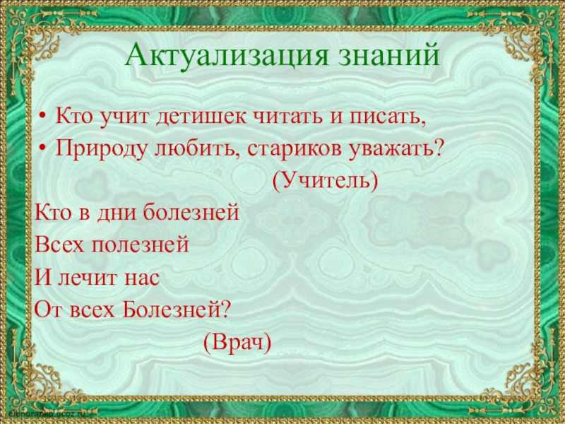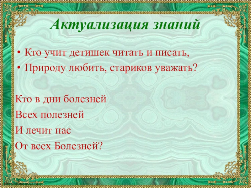 Актуализация знанийКто учит детишек читать и писать,Природу любить, стариков уважать? Кто в дни болезнейВсех полезнейИ лечит нас