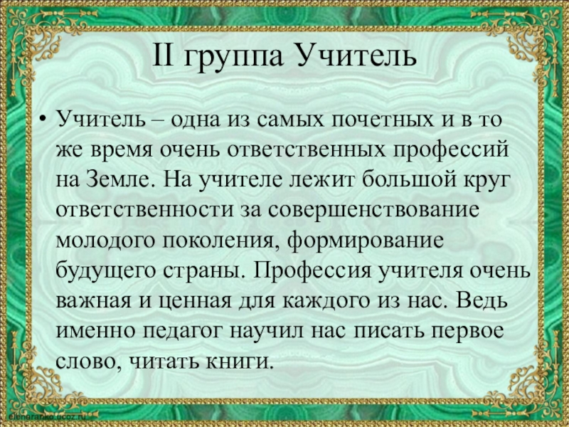 ІІ группа УчительУчитель – одна из самых почетных и в то же время очень ответственных профессий на