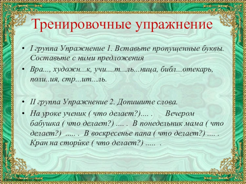 Тренировочные упражнениеІ группа Упражнение 1. Вставьте пропущенные буквы. Составьте с ними предложенияВра..., художн...к, учи....т...ль...ница, библ...отекарь, поли..ия, стр...ит...ль.ІІ