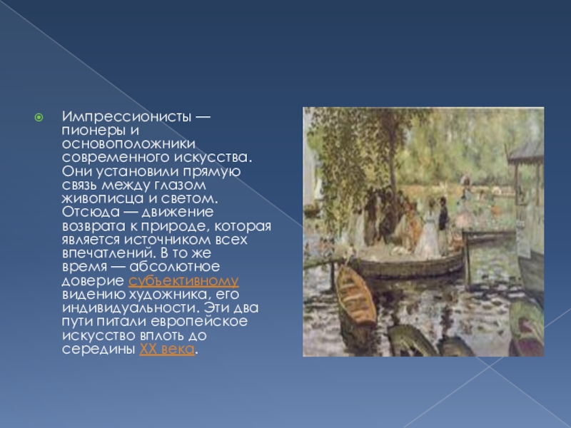 Слайд 18Импрессионисты — пионеры и основоположники современного искусства. Они установили прямую связь между