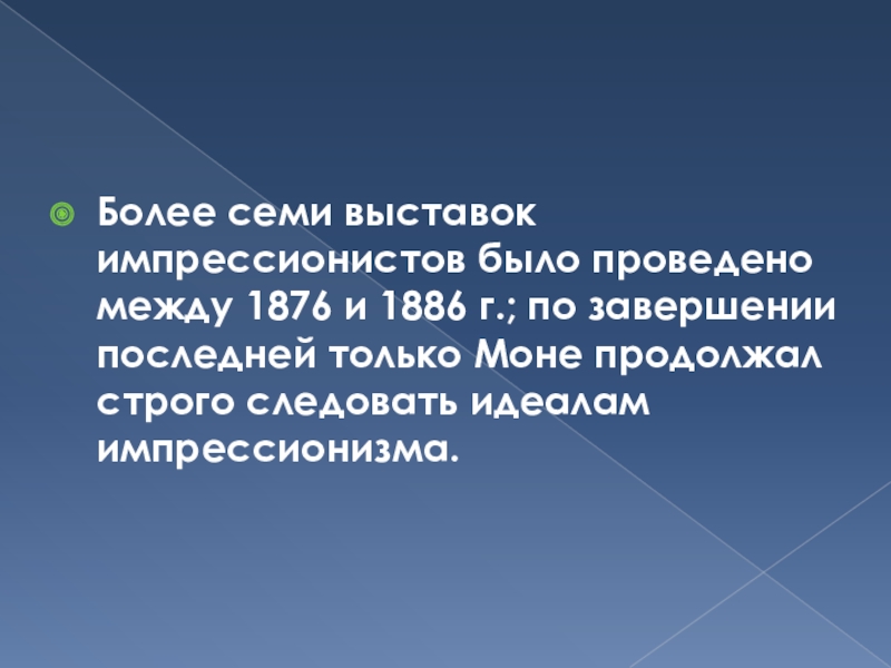 Слайд 8Более семи выставок импрессионистов было проведено между 1876 и 1886 г.;