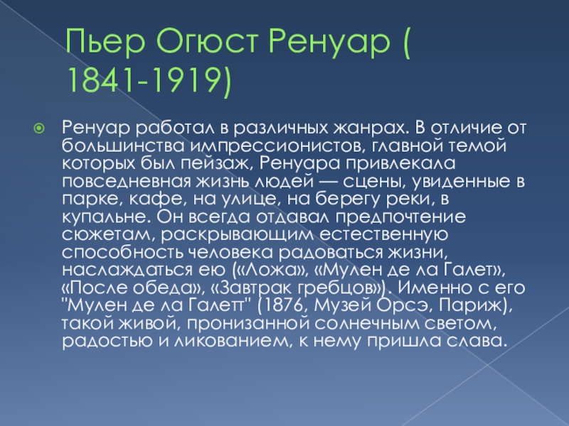от большинства импрессионистов, главной темой которых был пейзаж, Ренуара привлекала повседневная жизнь людей — сцены, увиденные в парке, кафе, на улице, на берегу реки, в купальне. Он всегда отдавал предпочтение сюжетам, раскрывающим естественную способность человека радоваться жизни, наслаждаться ею («Ложа», «Мулен де ла Галет», «После обеда», «Завтрак гребцов»). Именно с его "Мулен де ла Галетт" (1876, Музей Орсэ, Париж), такой живой, пронизанной солнечным светом, радостью и ликованием, к нему пришла слава.