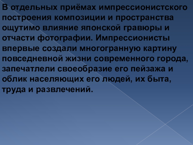 Слайд 5В отдельных приёмах импрессионистского построения композиции и пространства ощутимо влияние японской