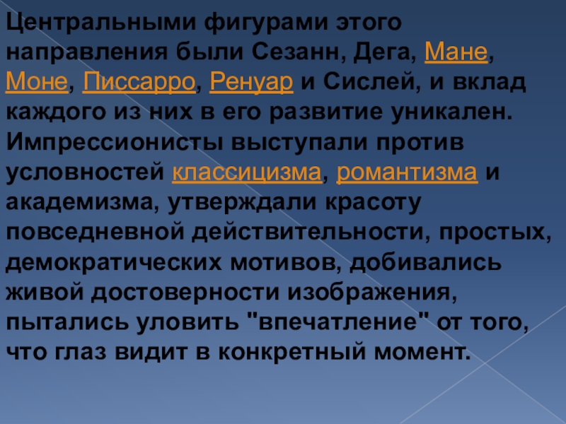 Слайд 3Центральными фигурами этого направления были Сезанн, Дега, Мане, Моне, Писсарро, Ренуар