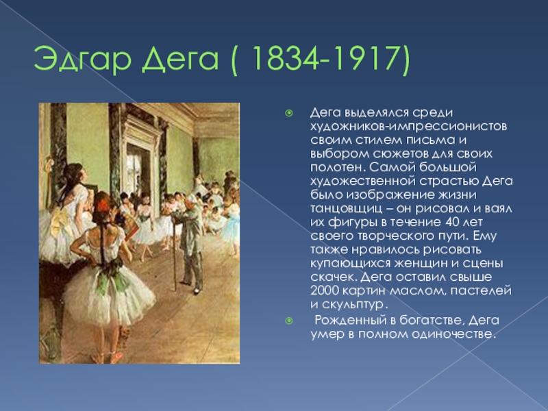 выбором сюжетов для своих полотен. Самой большой художественной страстью Дега было изображение жизни танцовщиц – он рисовал и ваял их фигуры в течение 40 лет своего творческого пути. Ему также нравилось рисовать купающихся женщин и сцены скачек. Дега оставил свыше 2000 картин маслом, пастелей и скульптур.