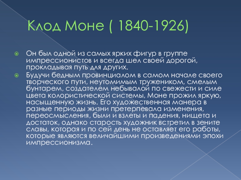 Будучи бедным провинциалом в самом начале своего творческого пути, неутомимым тружеником, смелым бунтарем, создателем небывалой по свежести и силе цвета колористической системы, Моне прожил яркую, насыщенную жизнь. Его художественная манера в разные периоды жизни претерпевала изменения, переосмысления, были и взлеты и падения, нищета и достаток, однако старость художник встретил в зените славы, которая и по сей день не оставляет его работы, которые являются величайшими произведениями эпохи импрессионизма.