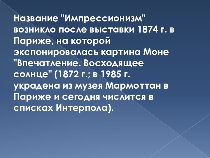 Слайд 6Название "Импрессионизм" возникло после выставки 1874 г. в Париже, на которой