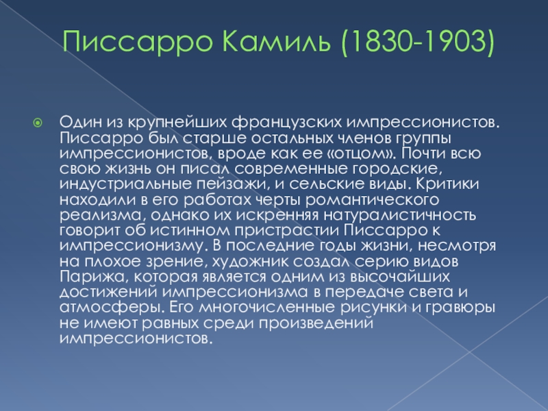 остальных членов группы импрессионистов, вроде как ее «отцом». Почти всю свою жизнь он писал современные городские, индустриальные пейзажи, и сельские виды. Критики находили в его работах черты романтического реализма, однако их искренняя натуралистичность говорит об истинном пристрастии Писсарро к импрессионизму. В последние годы жизни, несмотря на плохое зрение, художник создал серию видов Парижа, которая является одним из высочайших достижений импрессионизма в передаче света и атмосферы. Его многочисленные рисунки и гравюры не имеют равных среди произведений импрессионистов.