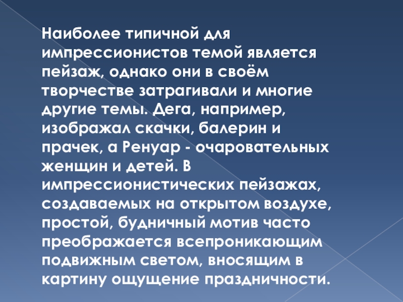 творчестве затрагивали и многие другие темы. Дега, например, изображал скачки, балерин и прачек, а Ренуар - очаровательных женщин и детей. В импрессионистических пейзажах, создаваемых на открытом воздухе, простой, будничный мотив часто преображается всепроникающим подвижным светом, вносящим в картину ощущение праздничности.