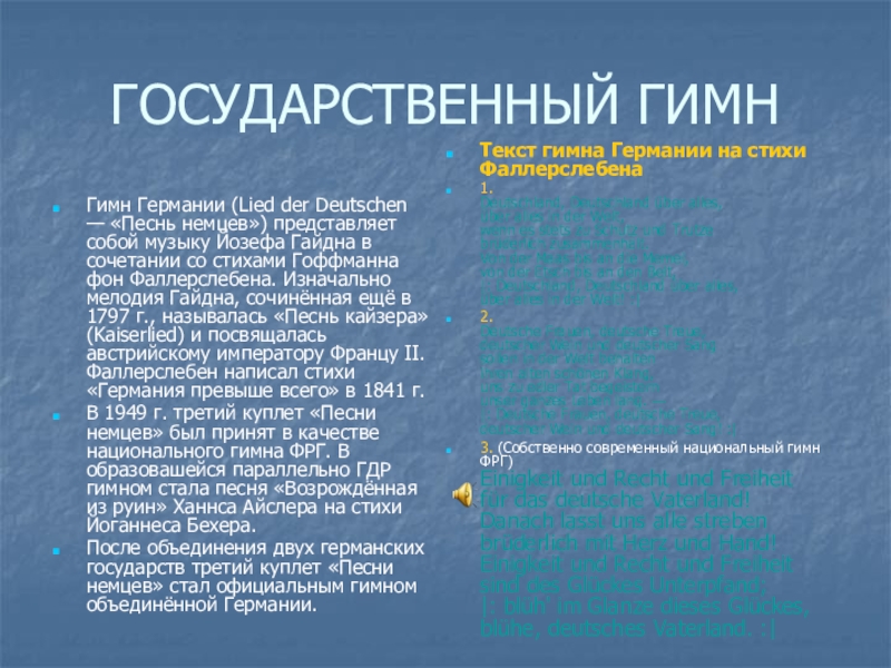 Гимн Германии (Lied der Deutschen — «Песнь немцев») представляет собой