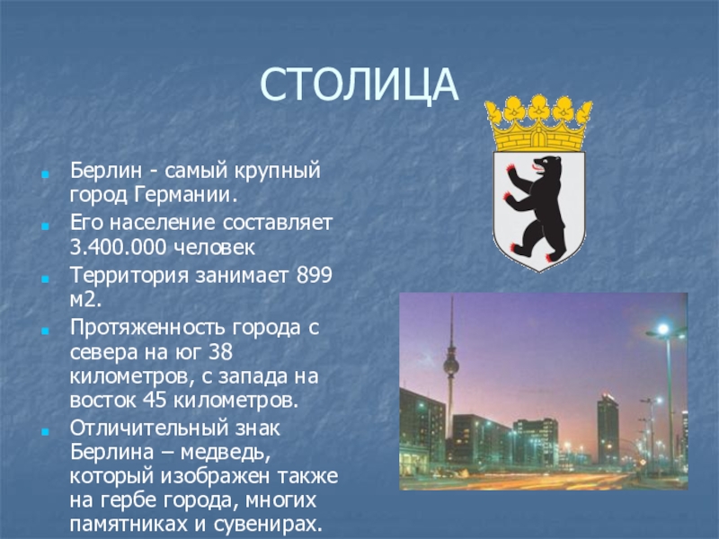 Отличительный знак Берлина – медведь, который изображен также на гербе города, многих памятниках и сувенирах.