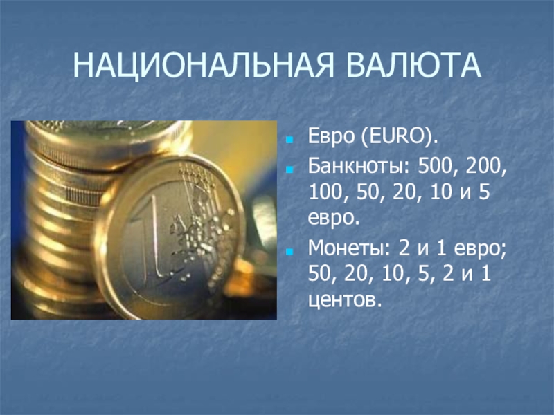 Монеты: 2 и 1 евро; 50, 20, 10, 5, 2 и 1 центов.