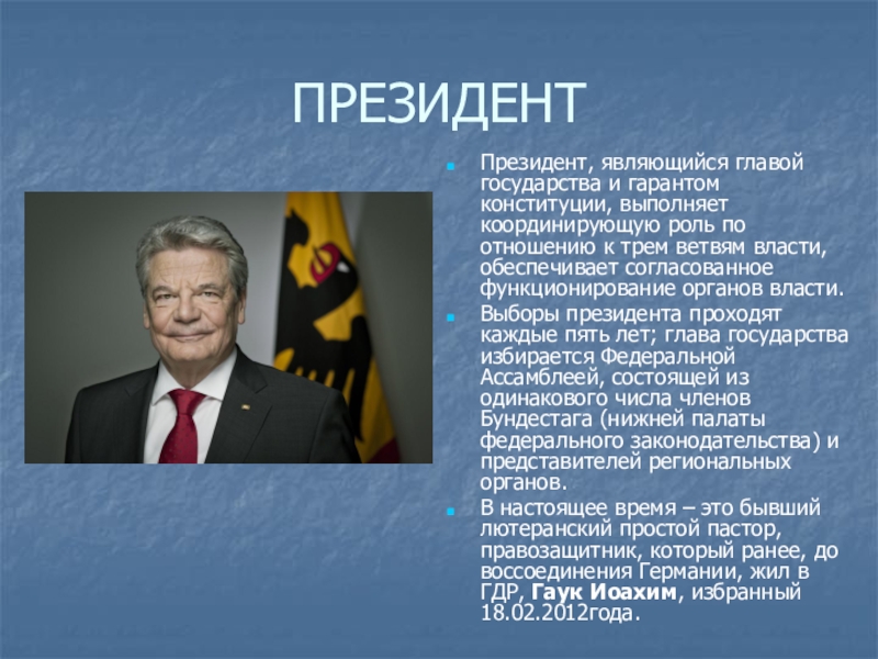 В настоящее время – это бывший лютеранский простой пастор, правозащитник, который ранее, до воссоединения Германии, жил в ГДР, Гаук Иоахим, избранный 18.02.2012года.