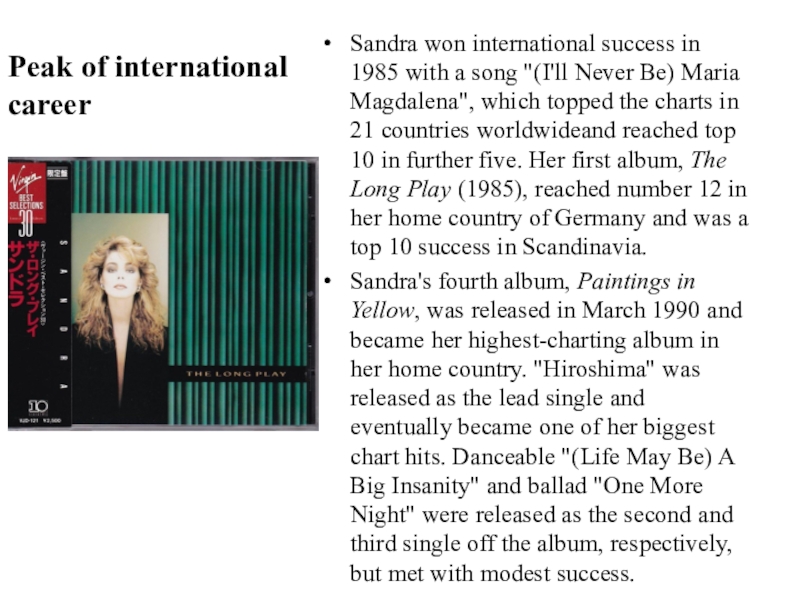 song "(I'll Never Be) Maria Magdalena", which topped the charts in 21 countries worldwideand reached top 10 in further five. Her first album, The Long Play (1985), reached number 12 in her home country of Germany and was a top 10 success in Scandinavia.