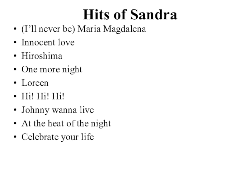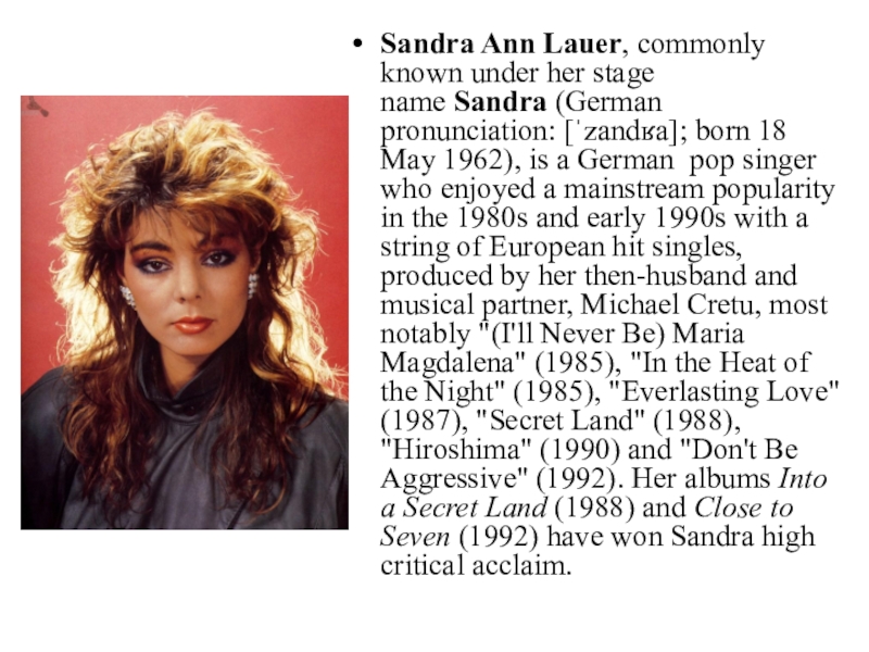 Слайд 2Sandra Ann Lauer, commonly known under her stage name Sandra (German pronunciation: [ˈzandʁa]; born 18