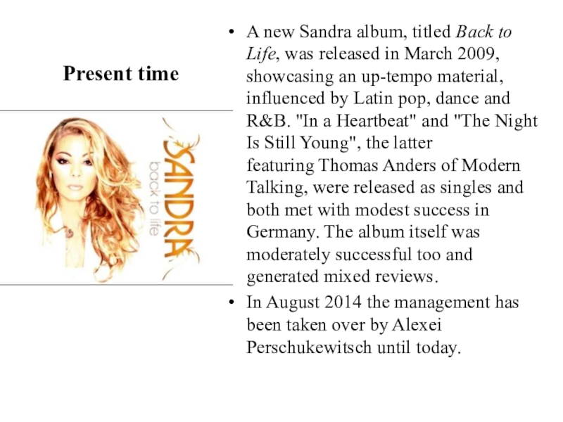 March 2009, showcasing an up-tempo material, influenced by Latin pop, dance and R&B. "In a Heartbeat" and "The Night Is Still Young", the latter featuring Thomas Anders of Modern Talking, were released as singles and both met with modest success in Germany. The album itself was moderately successful too and generated mixed reviews.