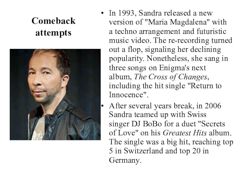 with a techno arrangement and futuristic music video. The re-recording turned out a flop, signaling her declining popularity. Nonetheless, she sang in three songs on Enigma's next album, The Cross of Changes, including the hit single "Return to Innocence".