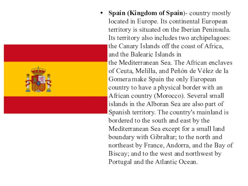 Слайд 2Spain (Kingdom of Spain)- country mostly located in Europe. Its continental