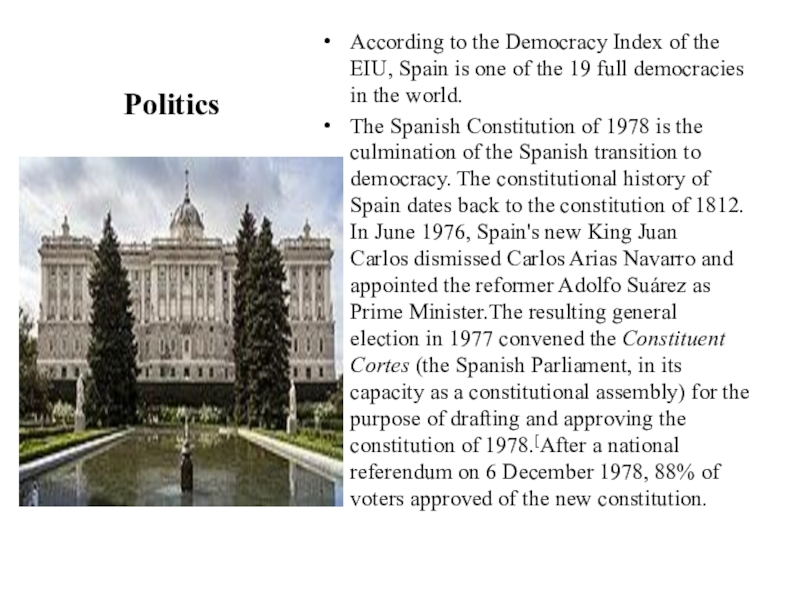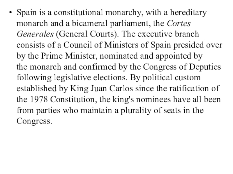Слайд 9Spain is a constitutional monarchy, with a hereditary monarch and a bicameral parliament,