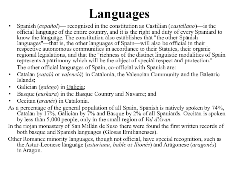 Spanish (español)— recognised in the constitution as Castilian (castellano)—is the official language of the