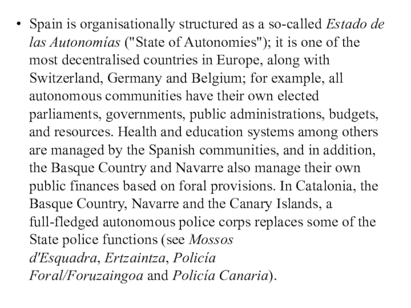 Слайд 10Spain is organisationally structured as a so-called Estado de las Autonomías ("State of