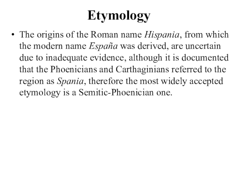 derived, are uncertain due to inadequate evidence, although it is documented that the Phoenicians and Carthaginians referred to the region as Spania, therefore the most widely accepted etymology is a Semitic-Phoenician one.