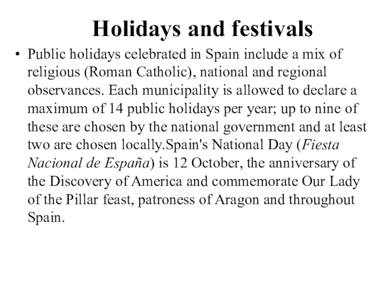 religious (Roman Catholic), national and regional observances. Each municipality is allowed to declare a maximum of 14 public holidays per year; up to nine of these are chosen by the national government and at least two are chosen locally.Spain's National Day (Fiesta Nacional de España) is 12 October, the anniversary of the Discovery of America and commemorate Our Lady of the Pillar feast, patroness of Aragon and throughout Spain.