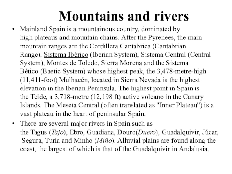 Mainland Spain is a mountainous country, dominated by high plateaus and mountain chains.