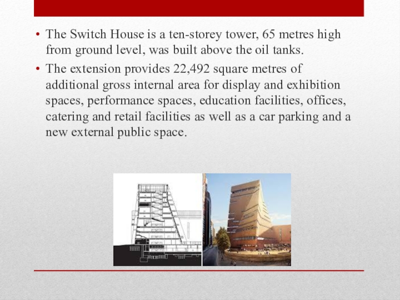 Слайд 5The Switch House is a ten-storey tower, 65 metres high from