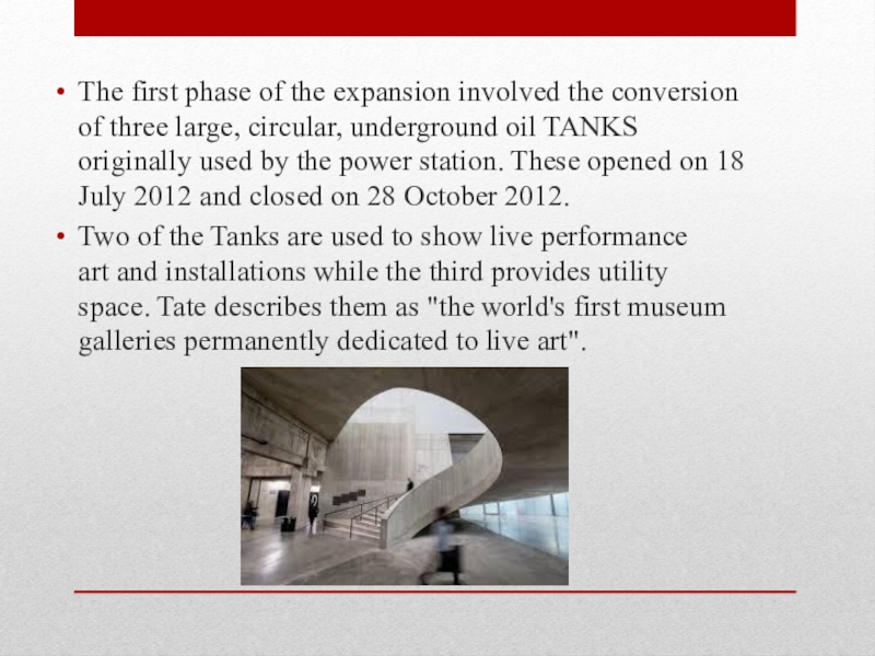 Two of the Tanks are used to show live performance art and installations while the third provides utility space. Tate describes them as "the world's first museum galleries permanently dedicated to live art".