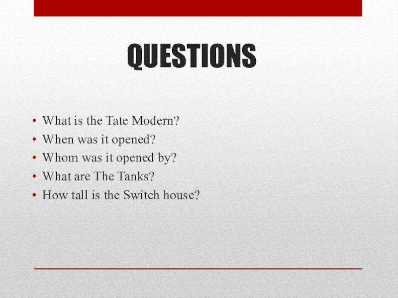 QUESTIONSWhat is the Tate Modern?When was it opened?Whom was it opened by?What are The Tanks?How tall is