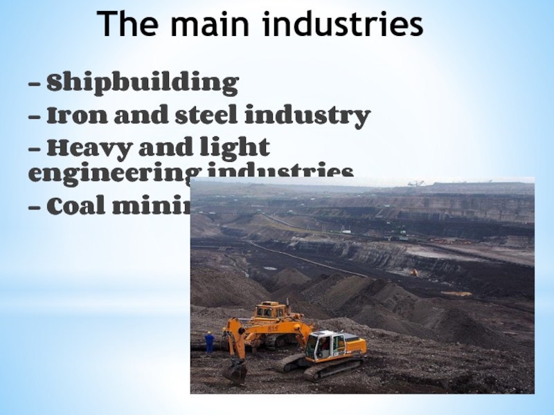 The main industries- Shipbuilding- Iron and steel industry- Heavy and light engineering industries- Coal mining