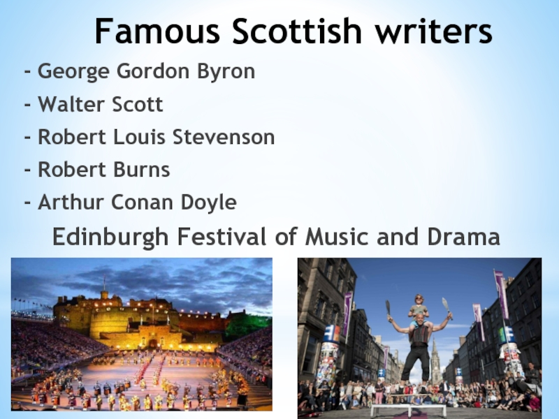 Famous Scottish writers- George Gordon Byron- Walter Scott- Robert Louis Stevenson- Robert Burns- Arthur Conan DoyleEdinburgh Festival