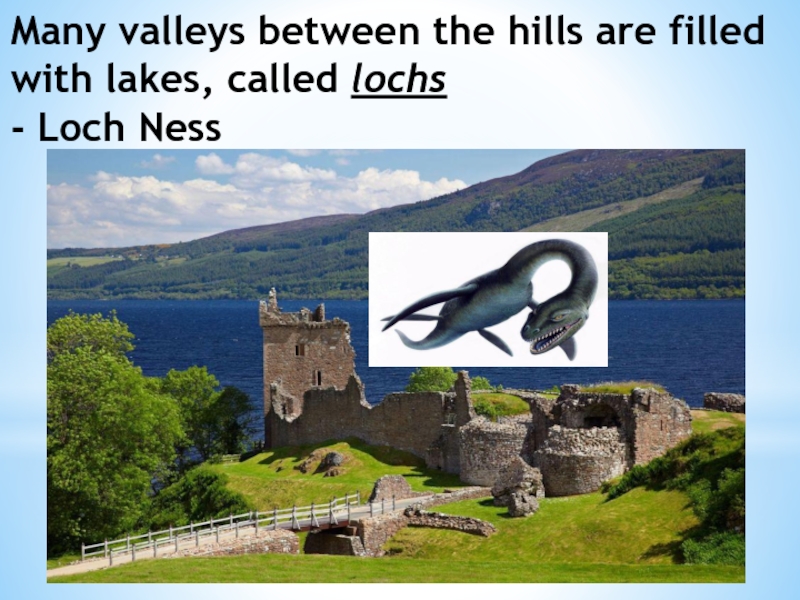 Слайд 7Many valleys between the hills are filled with lakes, called lochs -