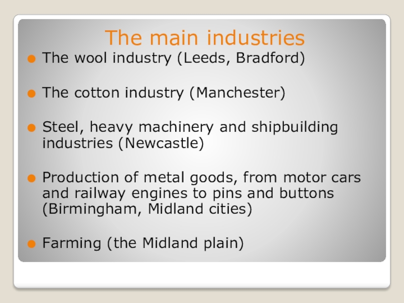 The main industriesThe wool industry (Leeds, Bradford)The cotton industry (Manchester)Steel, heavy machinery and shipbuilding industries (Newcastle)Production of