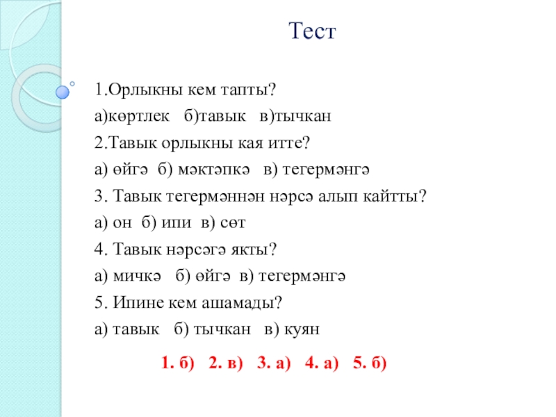 Тавык орлык тапты. Ул тегермәнгә китте. Тегермәннән он алып кайтты. Мичкә якты.