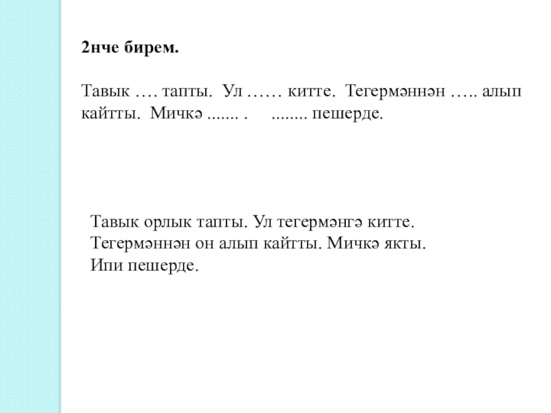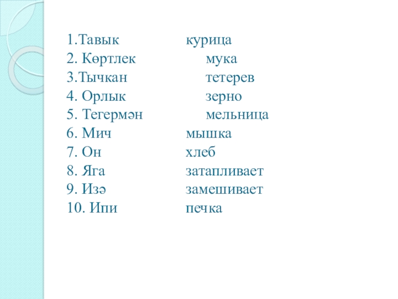 Тавык тегермәнгә барды. Тавык он алып кайтты.