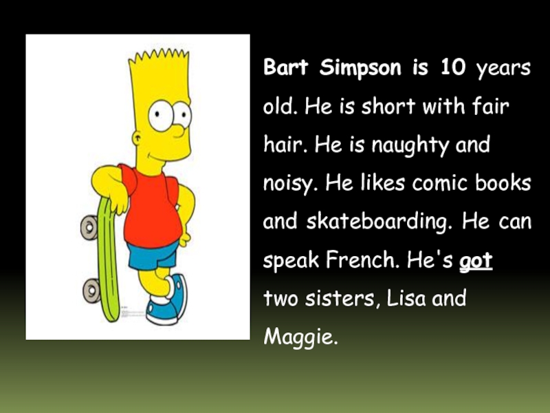 Слайд 15Bart Simpson is 10 years old. He is short with fair